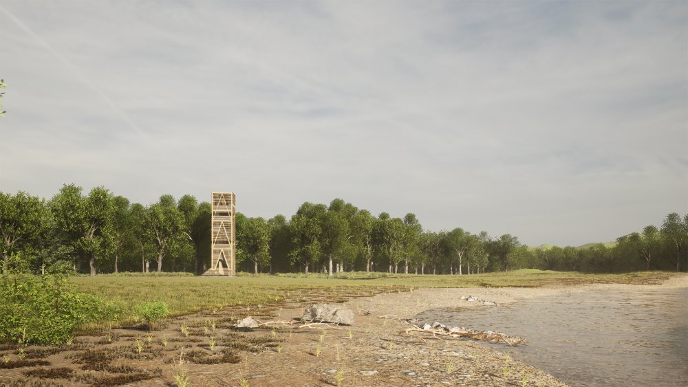Das Naturschutzgebiet Kranichwoog ist von landesweiter Bedeutung. Dort ist ein 24 m hoher Aussichtsturm entstanden. Der 6x6 m Grundriss ist um 45° gedreht. Hierdurch werden zwei Kanten des Quadrats genutzt, um die Aussicht zu erfahren. Der Innenraum des Turms wird durch seinen dreieckigen BSH-Kern zoniert. Um diesen herum winded sich die Treppe nach oben zu den drei Hauptpodesten. Innen bietet er Raum für Technik und die