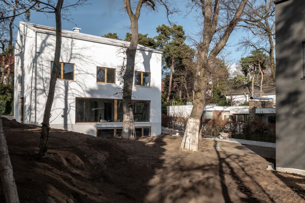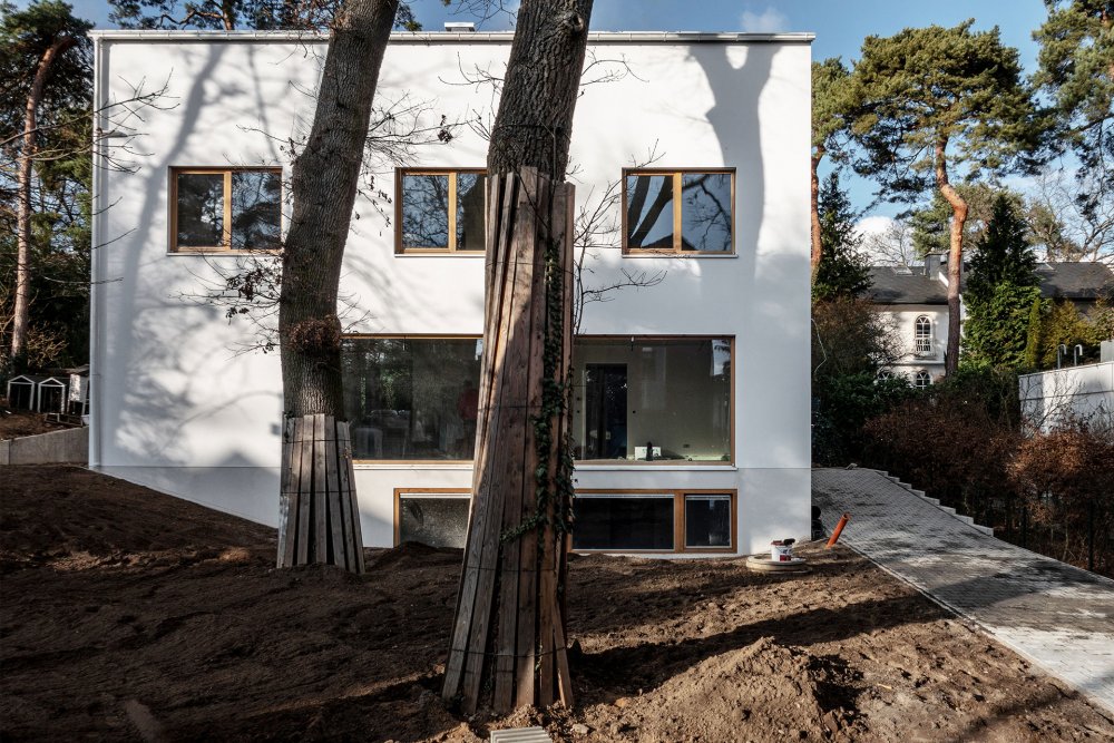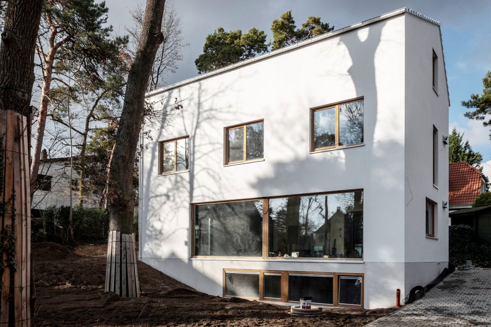 In dem Mehrparteien-Wohnhaus wird eine klare Grundrissteilung vorgesehen. Der grosszügige Wohnbereich mit grosser Verglasung verschmilzt mit dem Garten, kleinteilige Nebenräume bilden eine Pufferzone zu den Nachbarn. Die asymmetrische Lage des Dachfirstes spiegelt diese Aufteilung erkennbar wider. Dachdeckung und Fassade werden farblich angeglichen um ein möglichst monolithisches Erscheinungsbild zu erhalten. Das Herz des neuen Grundstücks bilden drei grosse Eichen, deren Kronen man von der eingeschnittenen Dachterrasse geniessen kann.